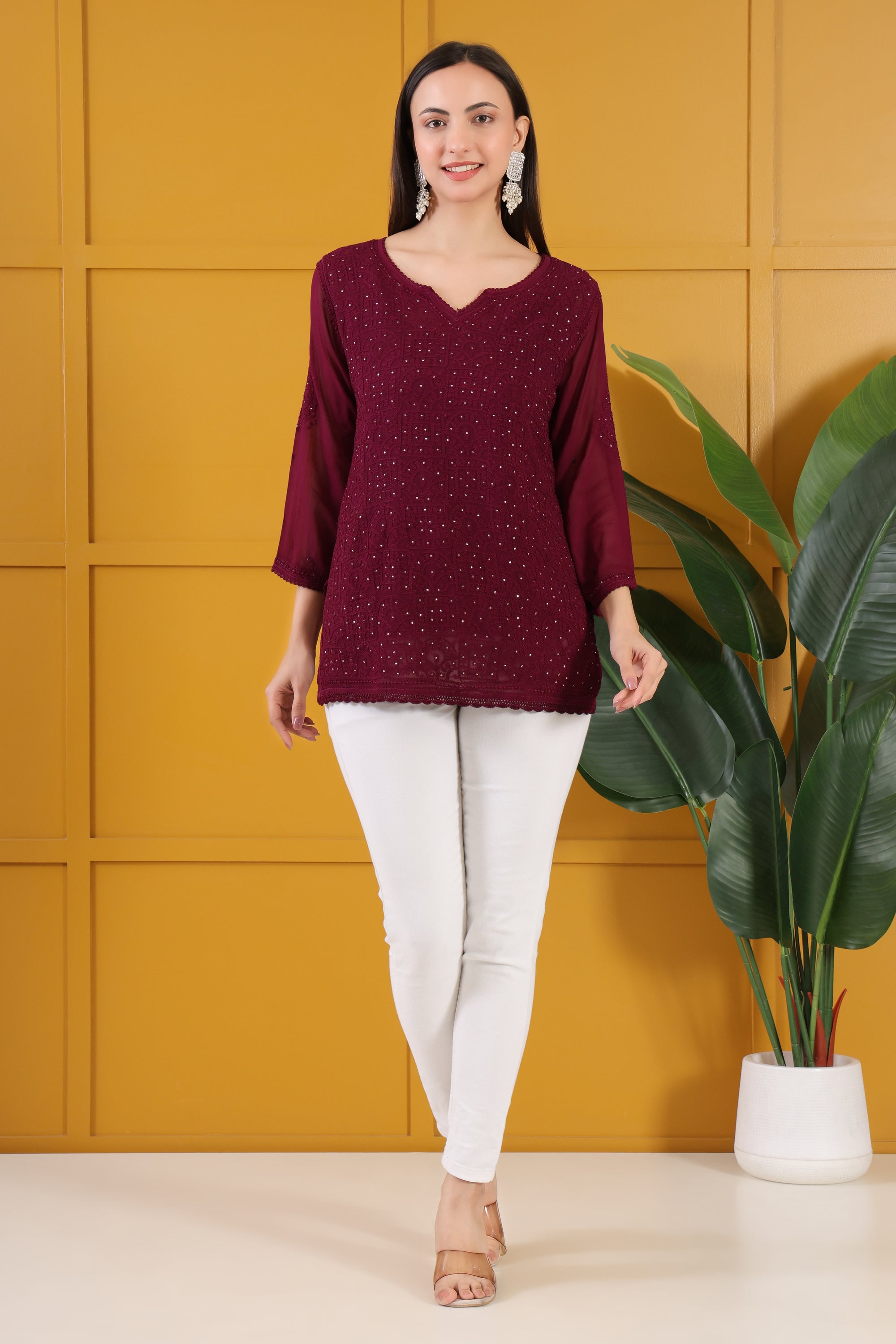 Grace and comfort come together in this elegant Chikankari Viscose Georgette Top. Hand-embroidered with delicate motifs, it features fine Chikankari detailing across the front and sleeves, adding subtle depth and texture. The soft viscose georgette fabric drapes beautifully, making it ideal for both everyday elegance and festive charm.